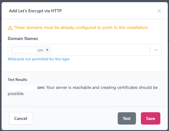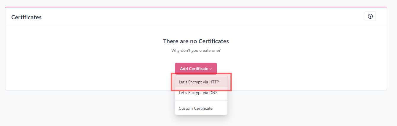 Certificates -> Add Certificates -> Let's Encrypt via HTTP