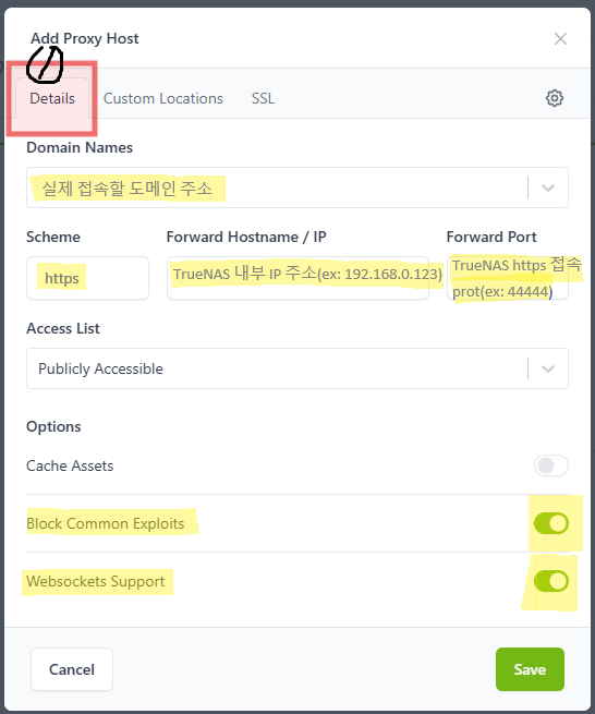 Websockerts Support를 선택하지 않으면 SSL로 접속했어도 TrueNAS가 HTTPS로 받아들이지 않는 문제가 있기 때문에 필수로 선택해야 하고, Force SSL을 선택해야 강제로 SSL로 접속합니다. 그밖에 옵션들은 속도가 빨라지거나, 기본적인 웹 공격 차단기능을 활성화 했구요, 활성화 하지 않은 부분은 필요 없거나 차후 문제가 생겼을때 여지를 남겨두었습니다.
