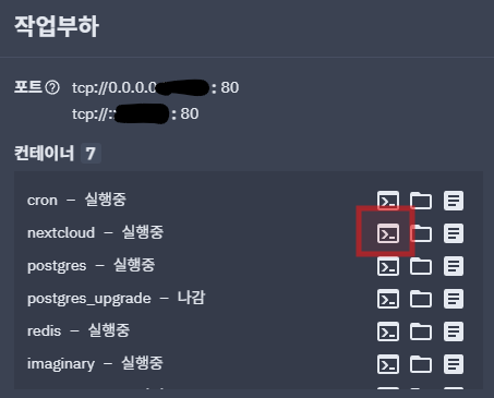 사진과 같이 nextcloud - 실행중 이라는 항목을 찾아주시구요, 우측의 첫번째 아이콘에 마우스를 올려보면 셸 이라고 나올거예요.