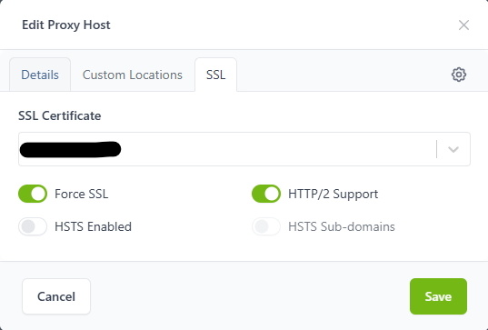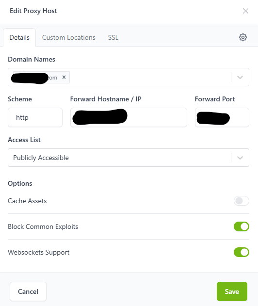 - Hosts -> Proxy Hosts 이동 후 Proxy host 추가, 다음과 같이 설정